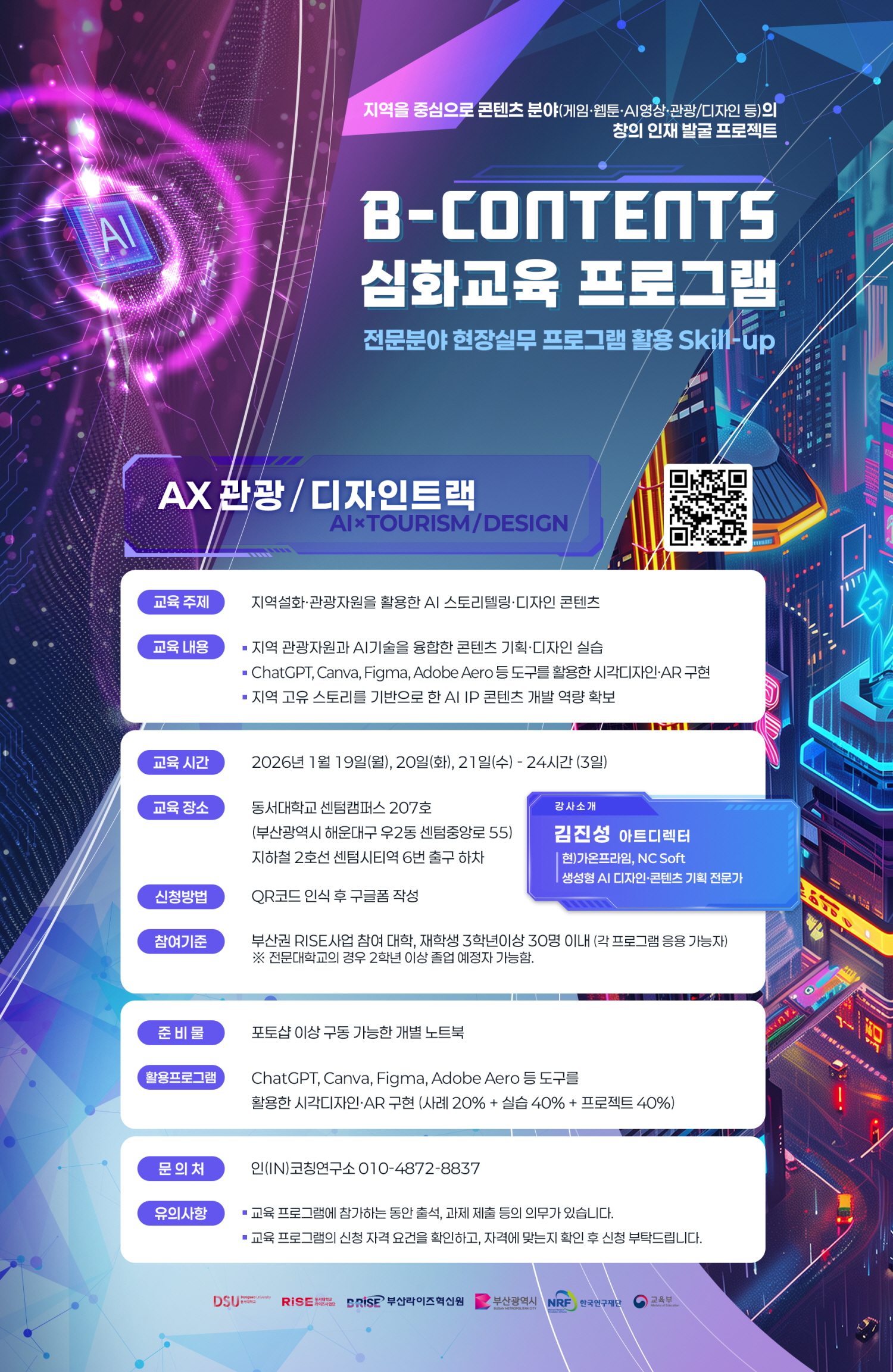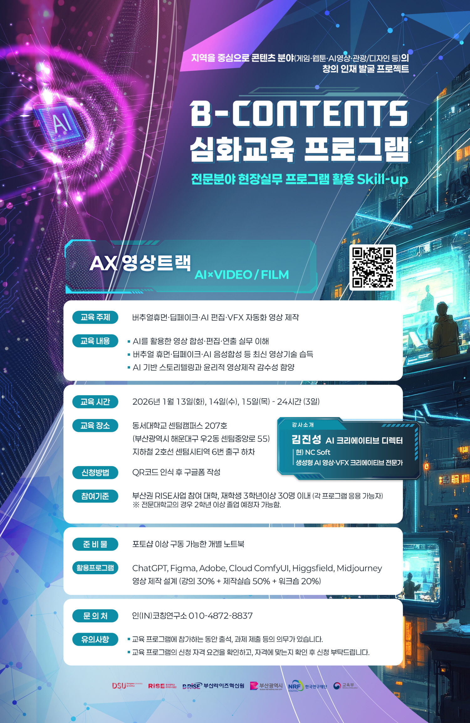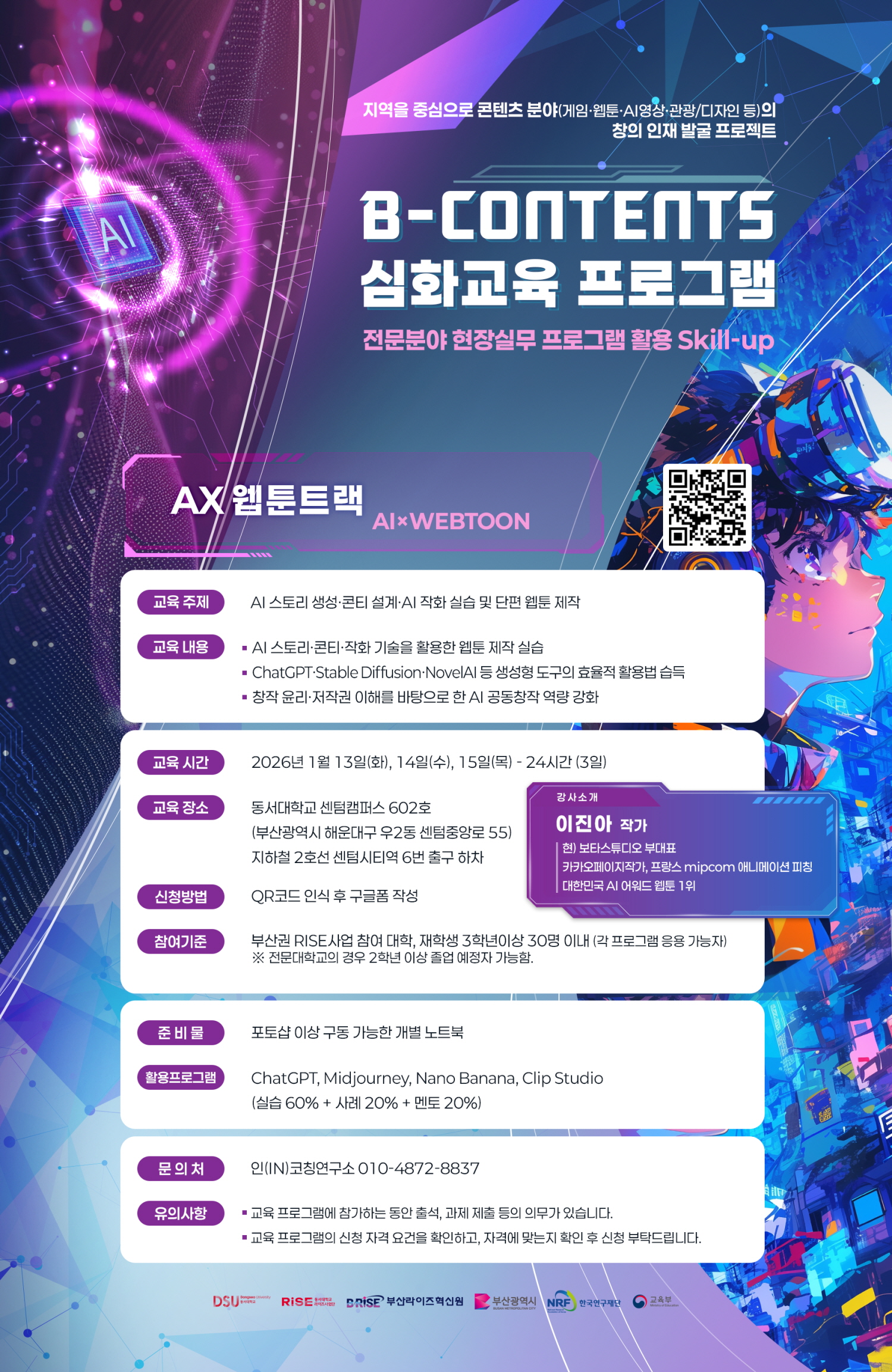 가. 행사명 1) 부산 rise 사업단 대학협력기반 거점구축과제, b-contents 심화교육 2) 부산 rise 사업단 대학협력기반 거점구축과제, b-contents festival(경진대회) 행사 나. 일시(세부일정은 각 계획안 참조) 1) b-contents 심화교육 - ax 게임트랙: 2026. 1.18.(일), 24(토), 25(일), 09:00~18:00 - ax 웹툰트랙: 2026. 1.13.(화) ~ 15(목). 09:00~18:00 - ax 영상트랙: 2026. 1.13.(화) ~ 15(목). 09:00~18:00 - ax 관광/디자인트랙: 2026. 1.19.(월) ~ 21(수). 09:00~18:00 2) b-contents festival(경진대회) - 접수마감: 2026. 1. 9. 금 (※접수인원 미달 시, 1.16.으로 연장 접수) - 중간일정: 계획안 참조 - 경진대회: 2026. 1. 30. 14:00~19:00 다. 대상: 동남권 rise 사업단 대학생(세부대상은 각 계획안 참조) 라. 신청: 각 홍보포스터 qr코드 참조 마. 장소: 동서대학교 센텀캠퍼스 및 부산권내 호텔(행사별 상이, 각 계획안 참조) 바. 예산: 동서대학교 rise 대학협력기반 거점구축과제(참여 대학별 분담금 없음) 사. 기타 문의 사항: 동서대학교 사무처) 051-320-1747
